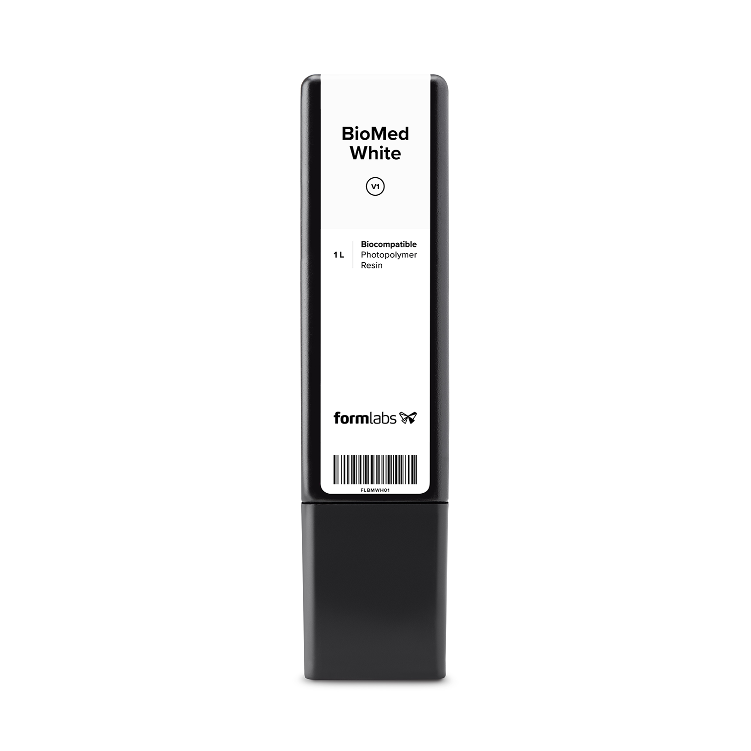 BioMed White Resin is a rigid material for biocompatible applications requiring long-term skin (>30 days) or short-term bone, tissue, dentin, and mucosal membrane contact (<24 hours).